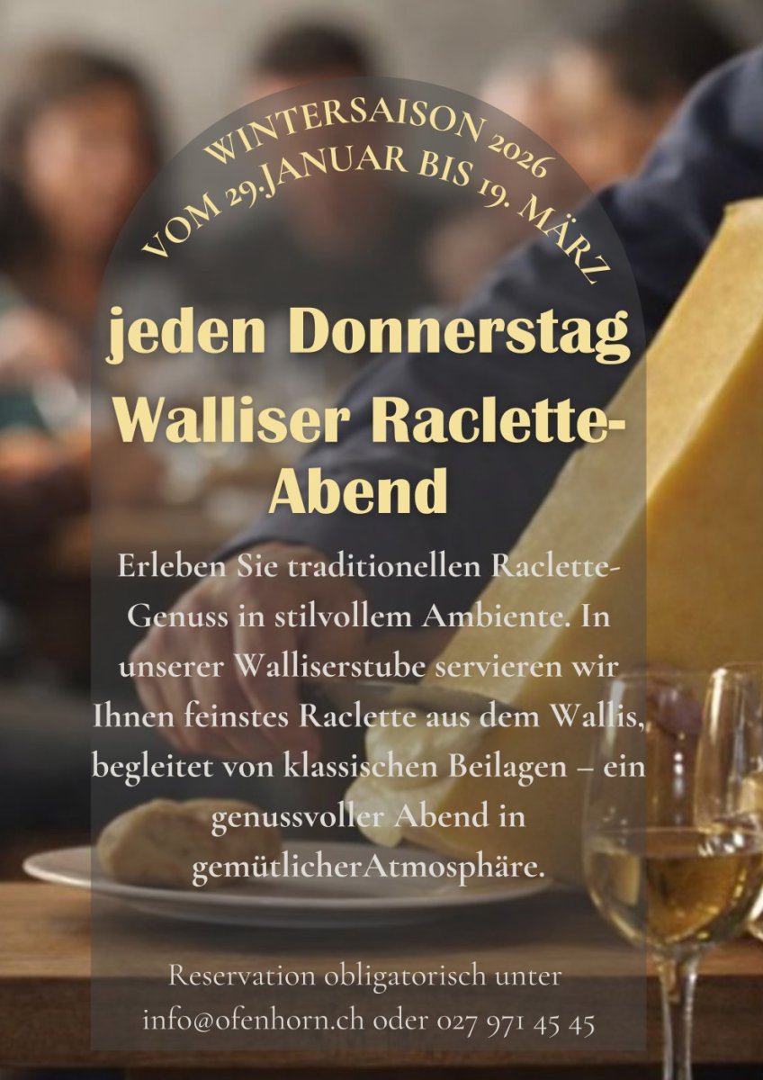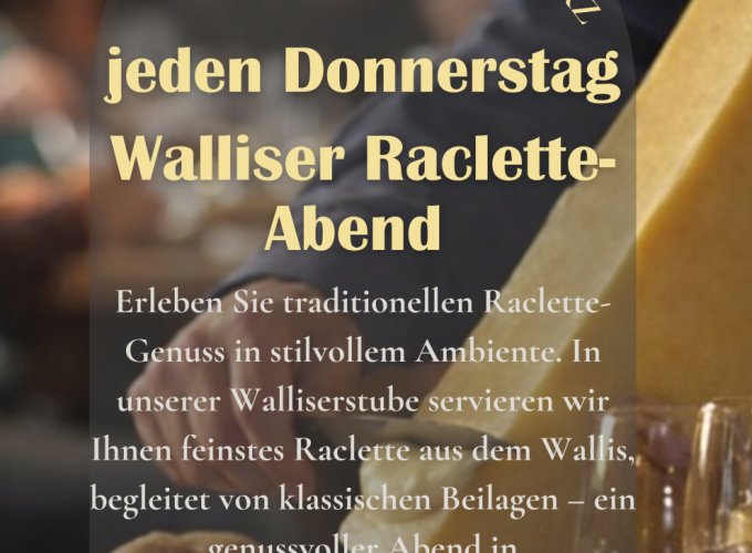 Erleben Sie traditionellen Raclette-Genuss in stilvollem Ambiente. In unserer Walliserstube servieren wir Ihnen feinstes Raclette aus dem Wallis, begleiten von klassischen Beilagen - ein genussvoller Abend in gemütlicher Atmosphäre.